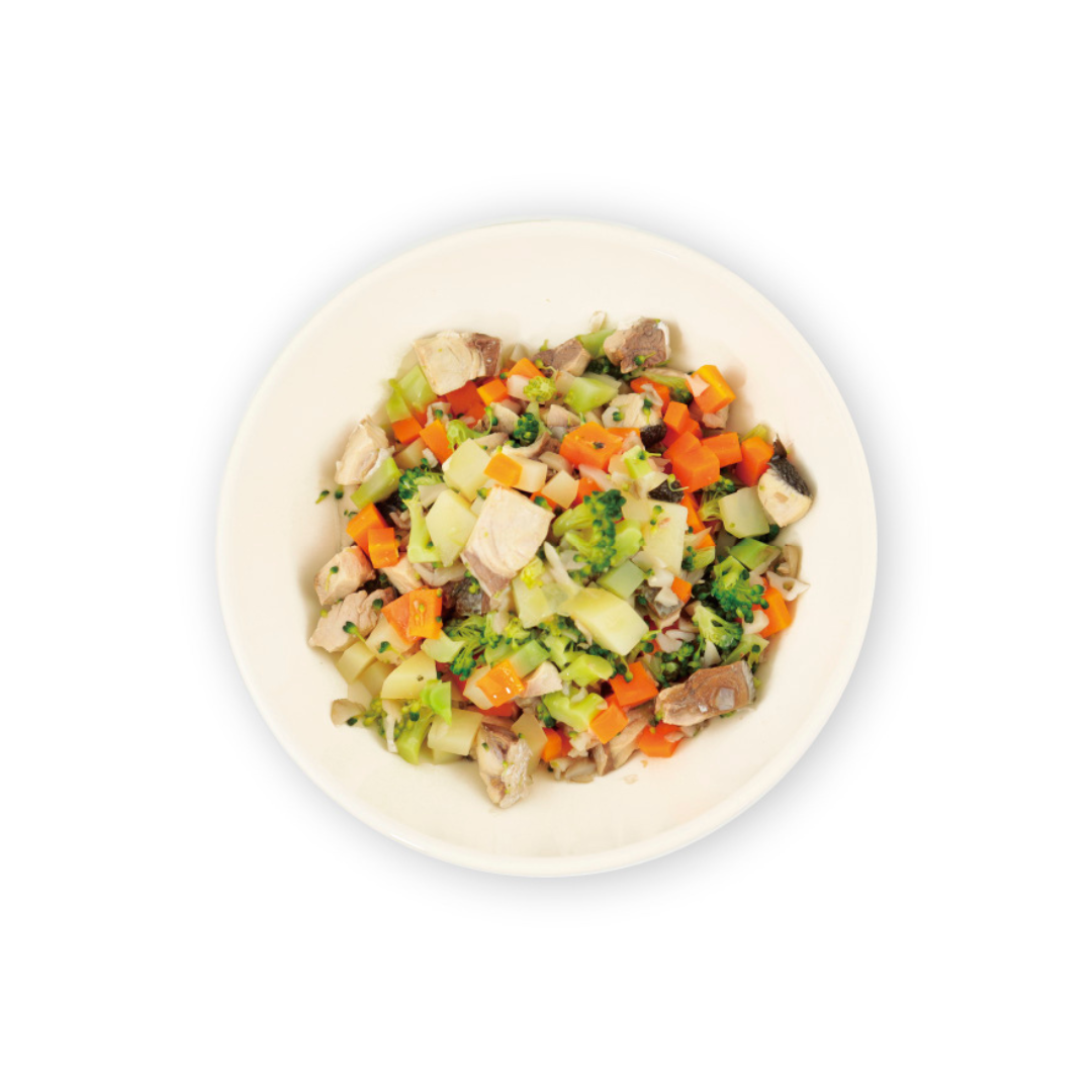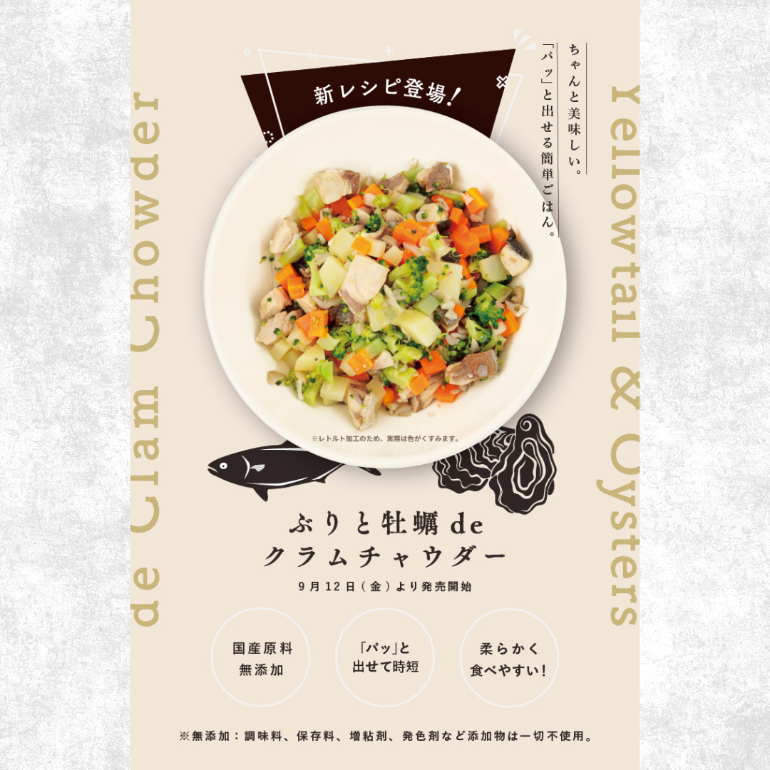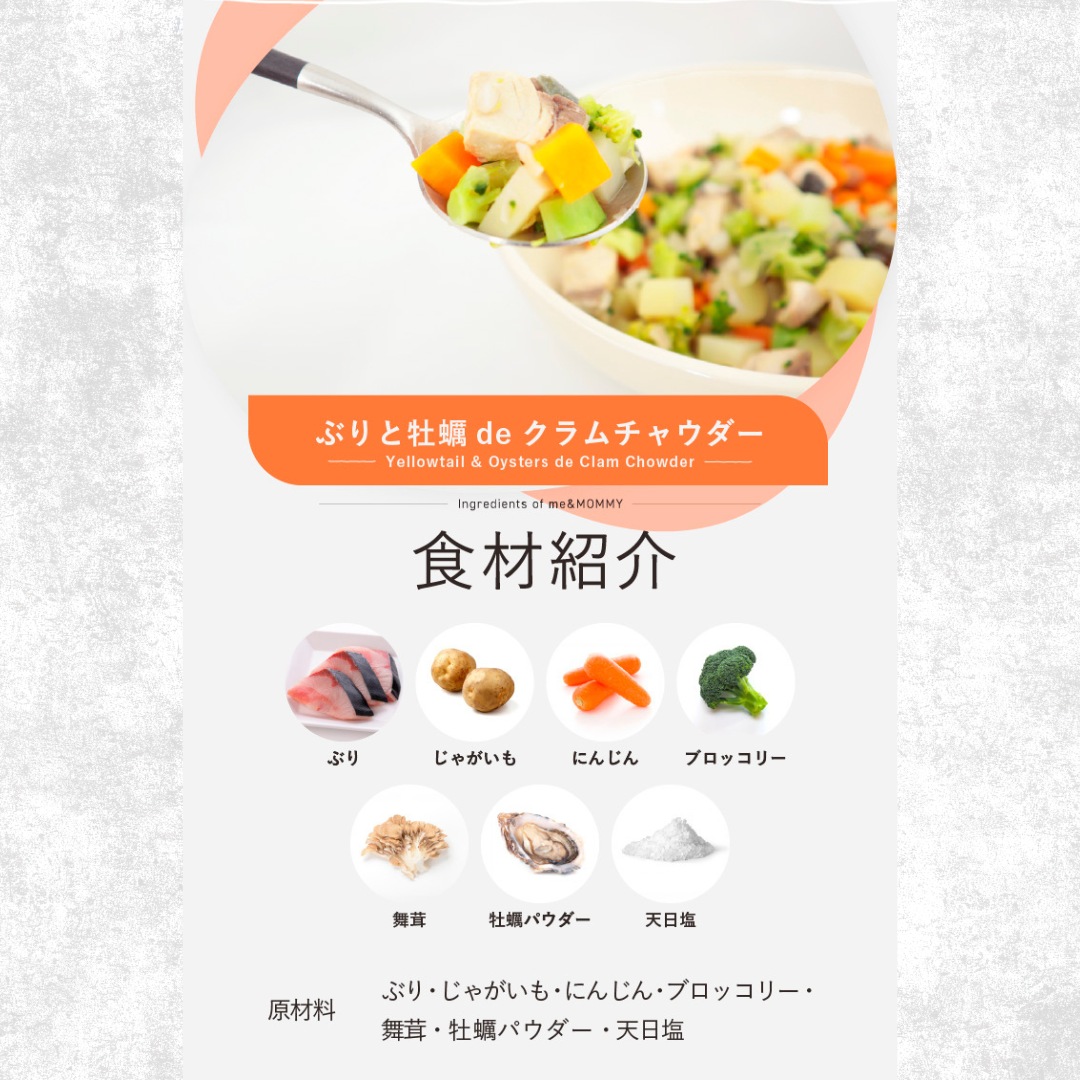 ぶり、じゃがいも、にんじん、ブロッコリー、まいたけ、牡蠣パウダー、天日塩