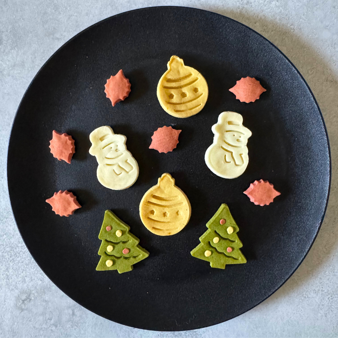 クリスマスツリー、オーナメント、雪だるま、ヒイラギの葉のかわいい形の米粉クッキーです。